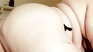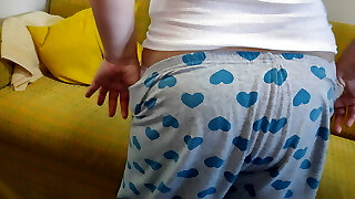 Elderly sexy Lukerya. Long pantaloons with lace cut into the pussy. Bottom view. Furry pussy and big round donk.