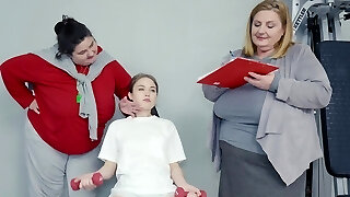 To burn off calories the bisexual blondie cougars with fake tits have a sweaty threesome in the gym