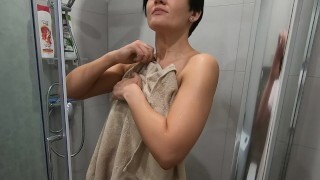 The husband put a hidden camera in the shower to spy on his wife. A milf with a unshaved pussy and thick tits is washed at home.