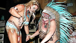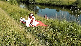 Nudist beach. Public nudity. Sexy Cougar without panties and bra sunbathes naked is not shy about fisherman. Naked in public. Milf