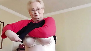 Horny red-haired mature lady is showing off her gigantic all natural breasts in striptease video