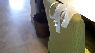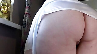 The camera witnesses the big backside under the short robe of my mature stepmother. Chubby milf in everyday life. Sexy bbw? Pawg.